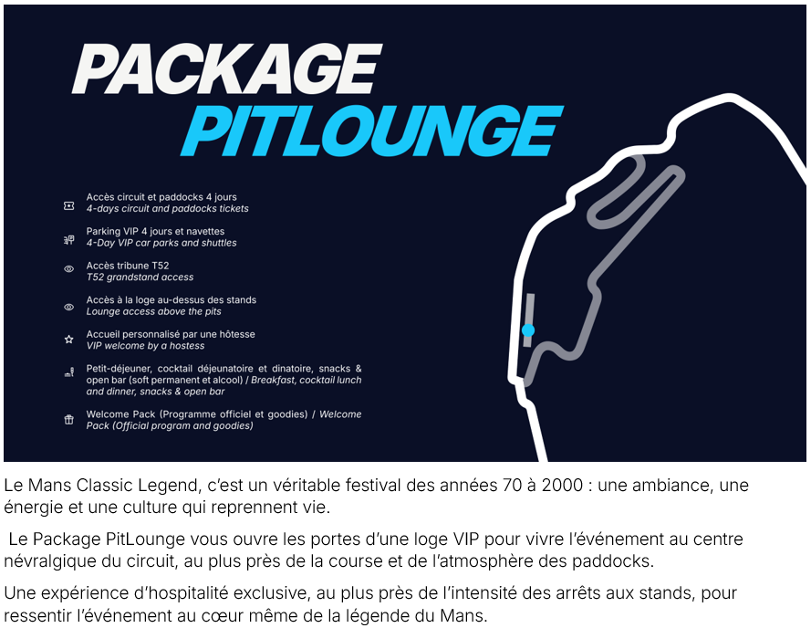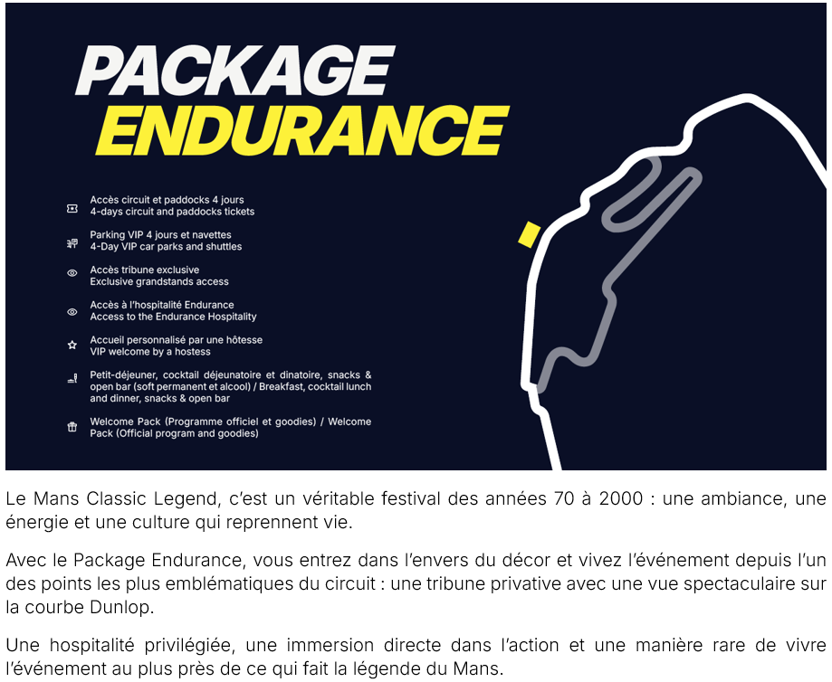 - Accès aux zones publiques : Buttes spectateurs, expos parking Clubs, animations musicales, Virages Mulsanne - Arnage (vendredi)
